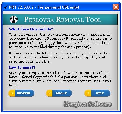 Gracias a iSergiwa es posible eliminar este virus, pues el a creado una herramienta de nombre Perlovga Removal Tool (PTR) la cual es una pequeña aplicación ya que solo pesa 37 kb.