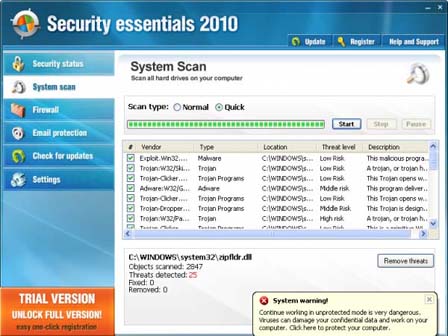 La gentileza se la debemos a Microsoft quien informó que ha aparecido una falsa aplicación de seguridad que simula ser la propia aplicación de seguridad de Microsoft (Microsoft Security Essentials) lanzada por la firma de Redmond en junio de 2009, la aplicación falsa tiene por nombre «Security Essentials 2010» y usa el mismo método persuasivo de todos las falsas aplicaciones ya que mediante un nombre relativamente familiar busca engañar a los usuarios menos expertos para que paguen por desinfectar el equipo. La nueva amenaza contiene el trojano Trojan Win32/Fakeinit.